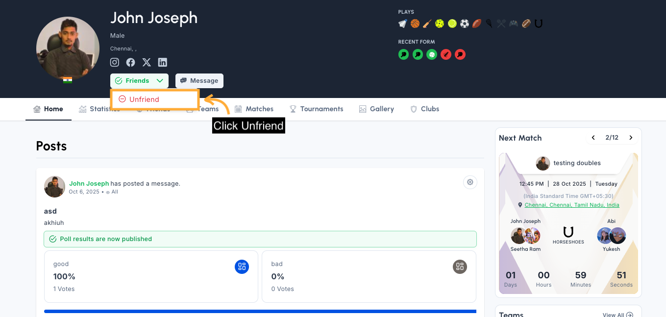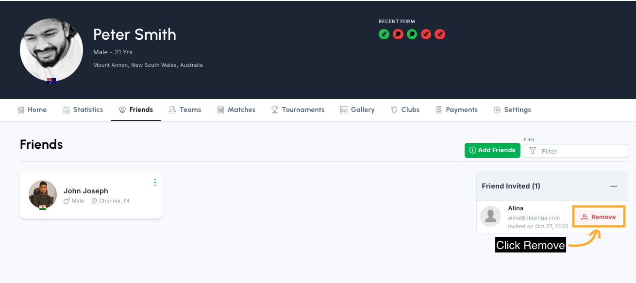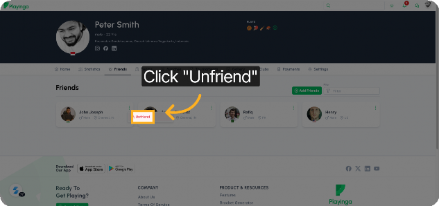 Removing friends on Playinga is easy. You can choose to follow either of the options below