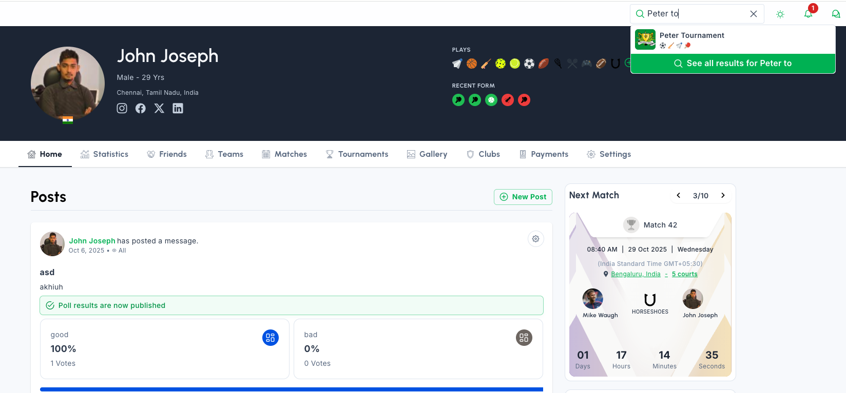 Tournaments in PLAYINGA are searchable and you as a player or your team can choose to participate in tournaments that accept applications. You can use the Search box at the top of your profile page to search for a tournament of your preference.