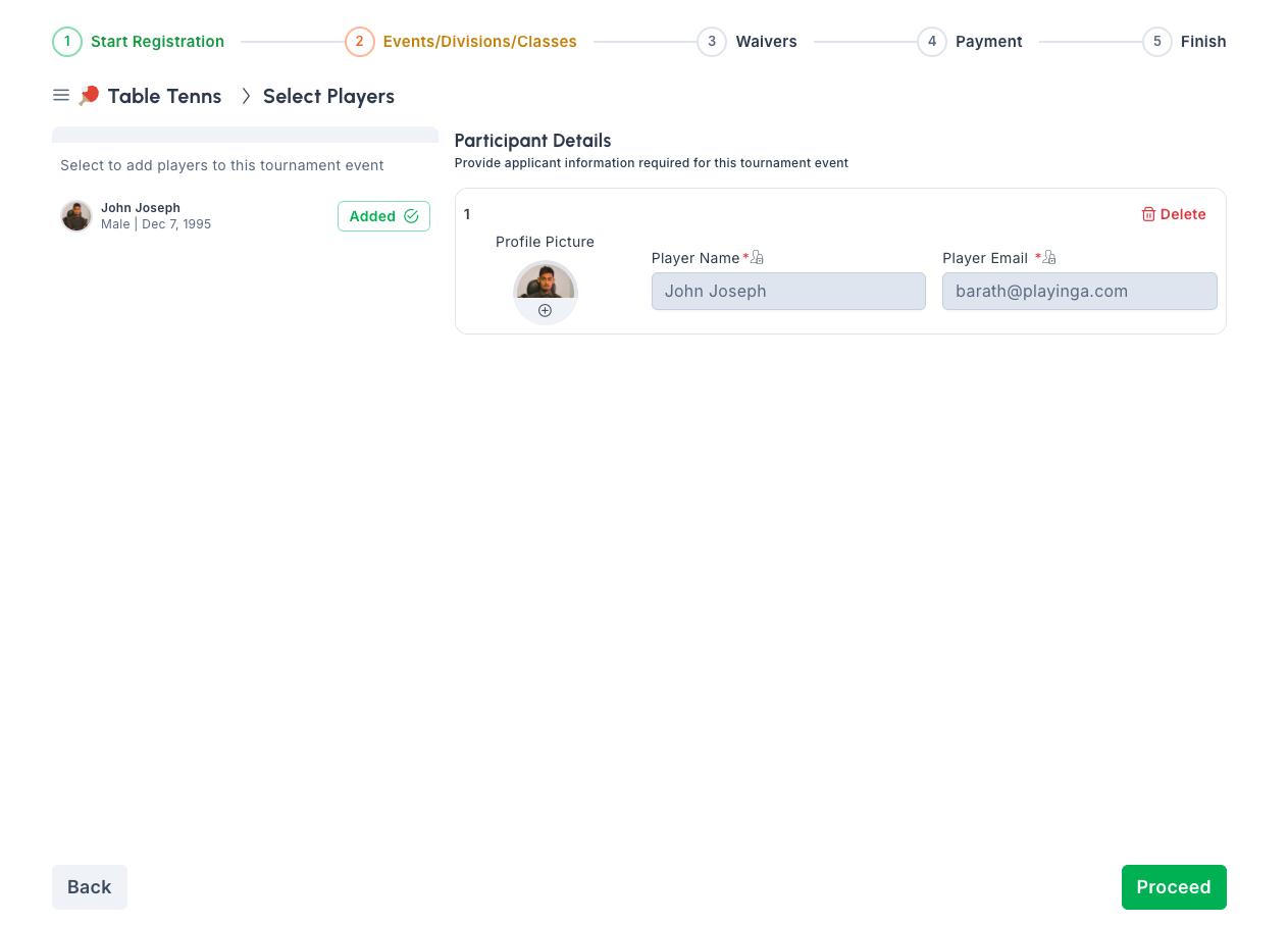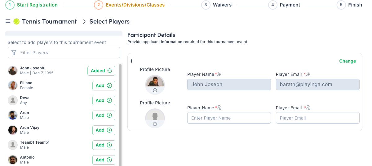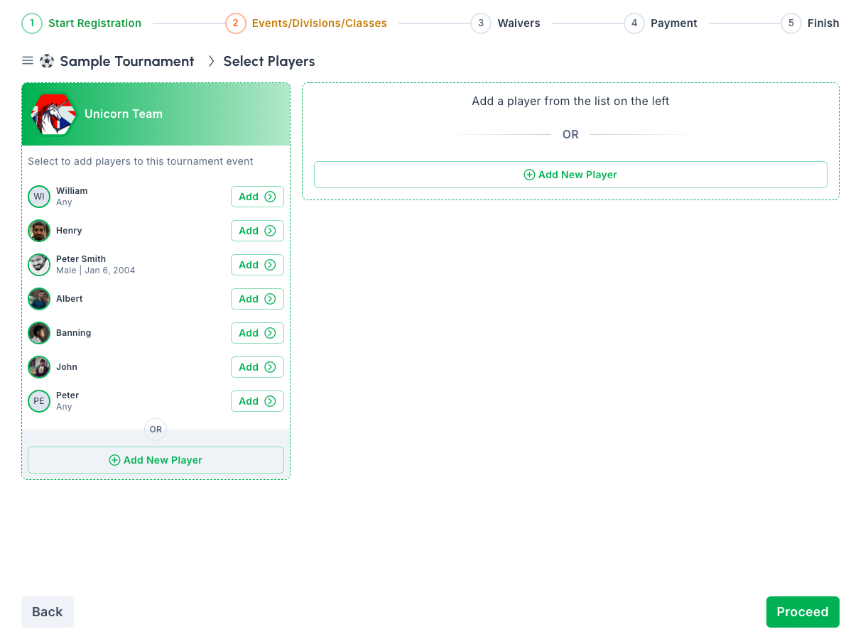 Step 7: After adding players, a list of divisions will appear, showing the selected division and the number of players added.