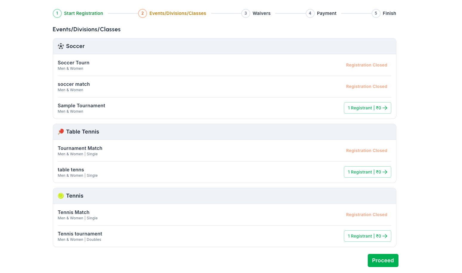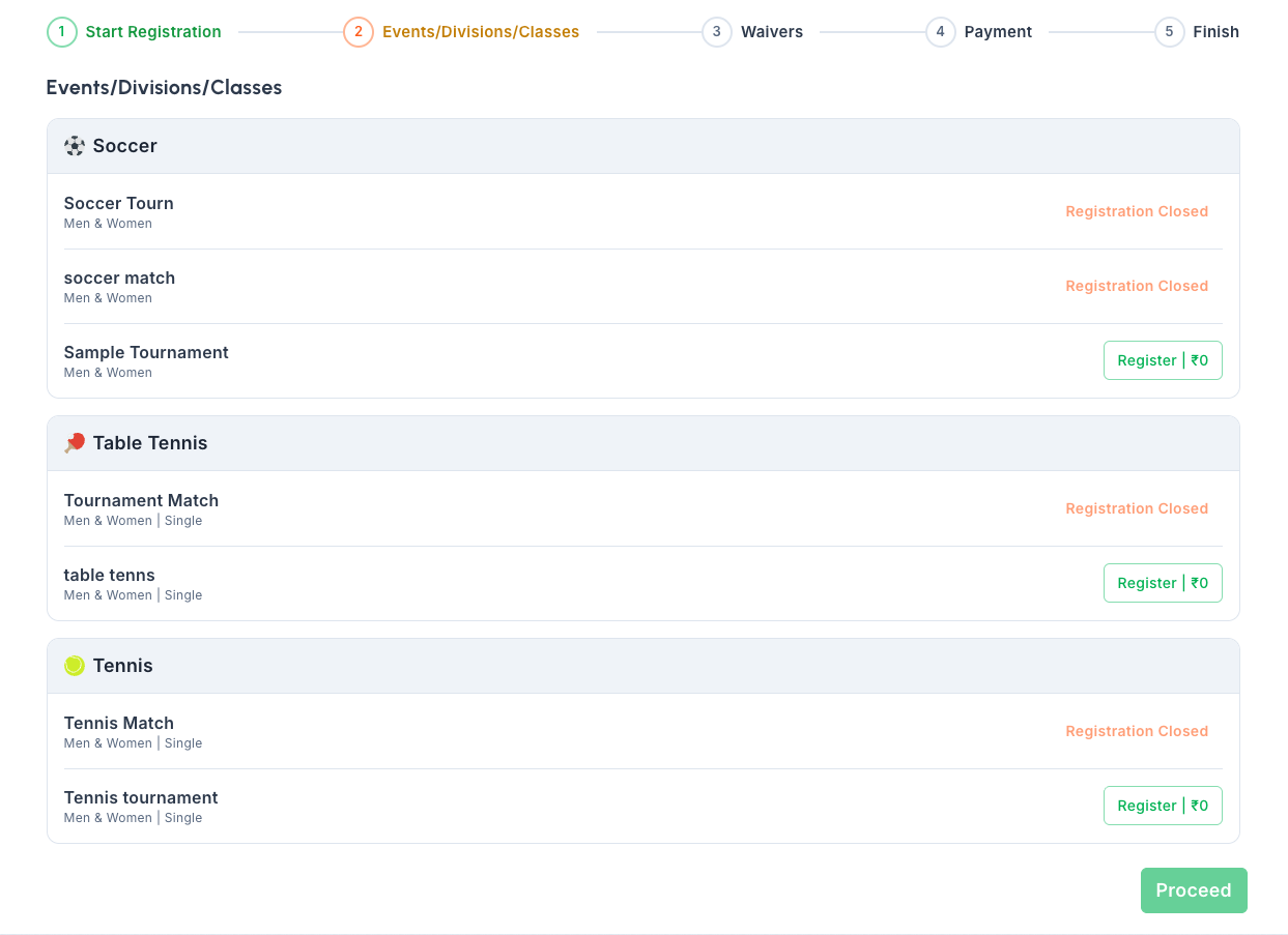 Step 5: Set of divisions with sports will be shown. Choose the division to which you want to register.