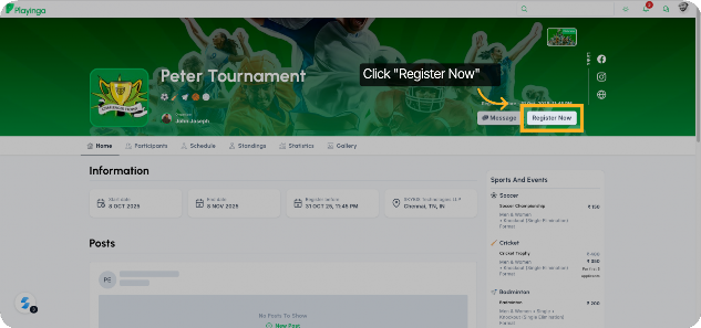 Step 3: You will land on the Tournament page, either from search results or through directly accessing the page. Once you are here, click on the Register Now button.
