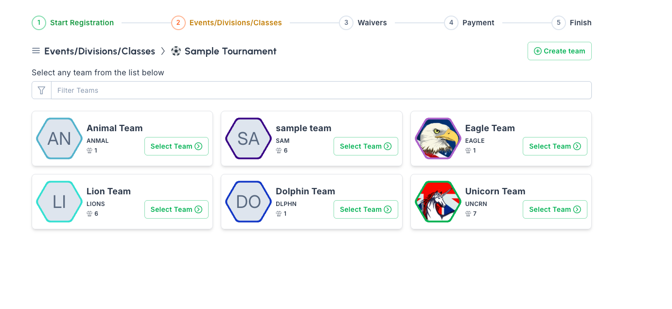 For team-related sports, Choose your team with which you would like to participate in this tournament or create a new team. If you like to apply with an existing team, select the team and click on Proceed.