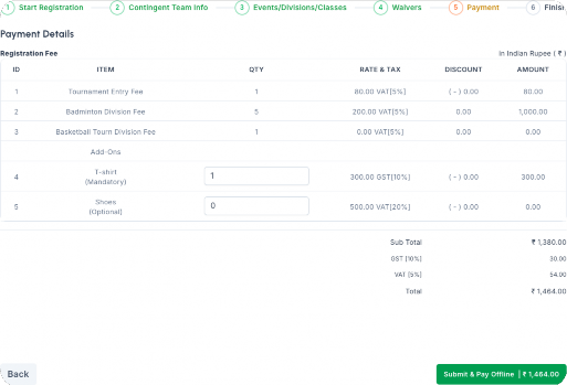 Step 9: If it is a paid tournament, you will be prompted to make a payment, either online or offline, as specified by the tournament. You can also include add-ons here. Then, click ‘Submit & Pay.’