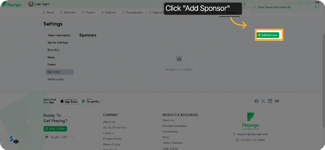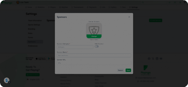 Step 2: A form titled sponsors will head up and upload the tournament sponsor's image. Fill sponsor category, sponsor name, sponsor URL and mention the if it is the title sponsor.