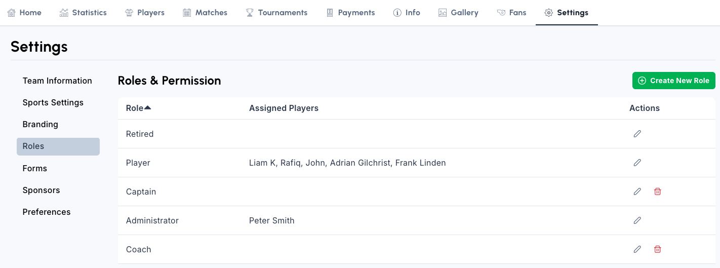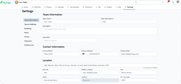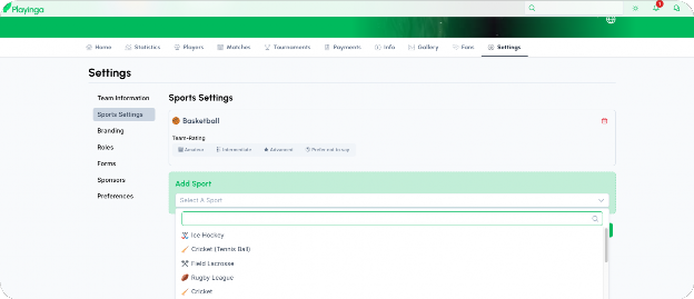 Teams in PLAYINGA have multiple configuration options that help you manage your team efficiently. From updating your team information to setting roles, branding, and preferences — each setting plays a key role in how your team appears and functions within the platform.