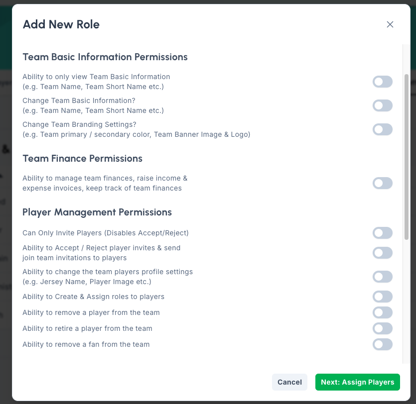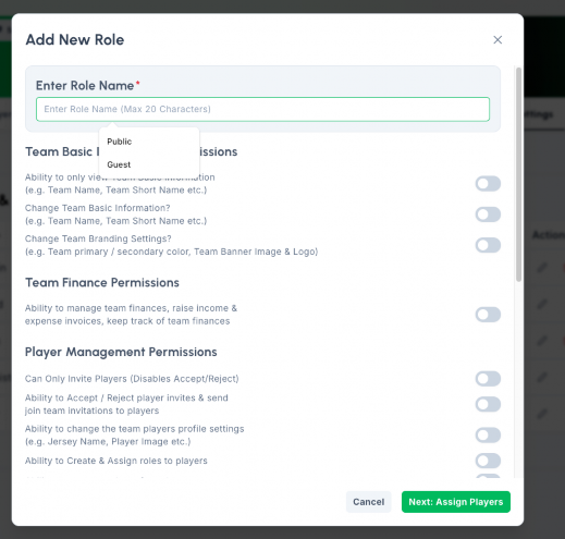 Step 4: If you want to Create a new role: Click “Create New Role”, button on top of the roles listing. Then, enter the role name, enable its characteristics of the role. then click Next: Assign Players, assign the players, and click Publish Role. The players will now be added to the new role.