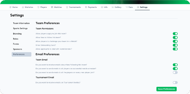 Step 2: Here, you can update Team Permissions and Email Preferences for both your team and tournaments.