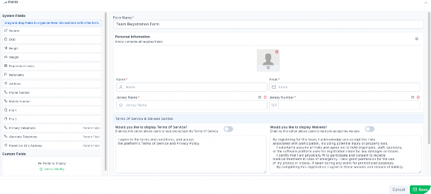 This form is where you set up the fields players will fill in when they register for a team. Remember, the form is fully customizable, so as an admin, you can update it anytime.
