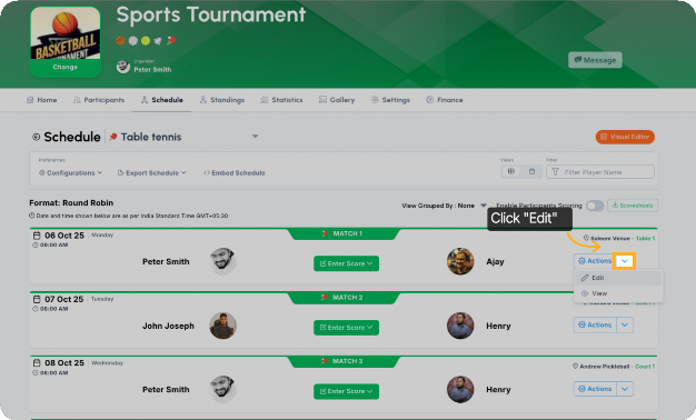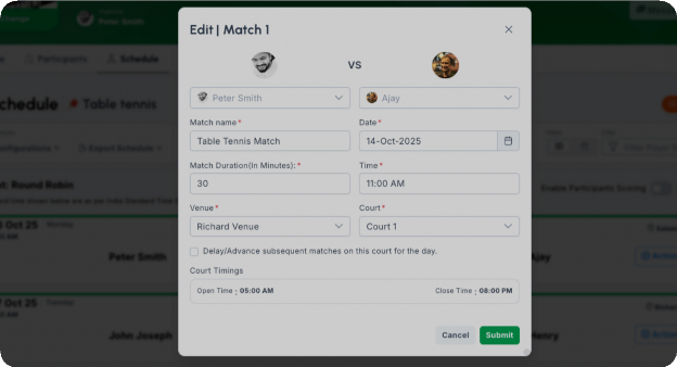 Step 7: Here, the current match details will appear. you can update the match name, date, time, venue and court details. After making the changes, click the Submit button.