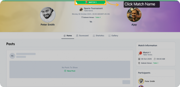 Step 2: Click the Matches sub-tab which appears along with other sub-tabs such as Feeds, Friends in the top middle of the profile page. This will display a list of matches including upcoming and past matches scheduled using PLAYINGA along with their schedule, match name and opponent name.