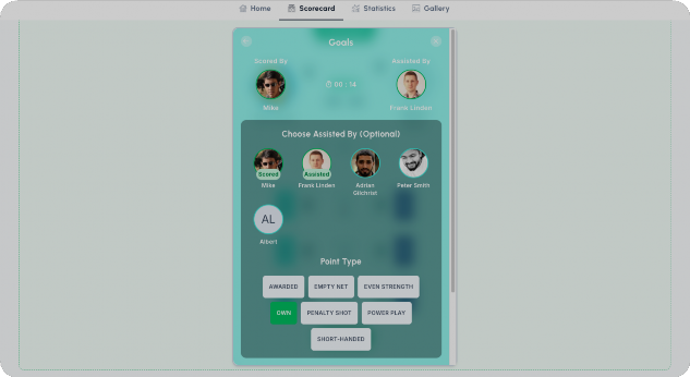To record a goal for a team, click the ‘Goal’ button on that side. Enter the required goal details such as the scoring player, the assisting player , and the goal type.