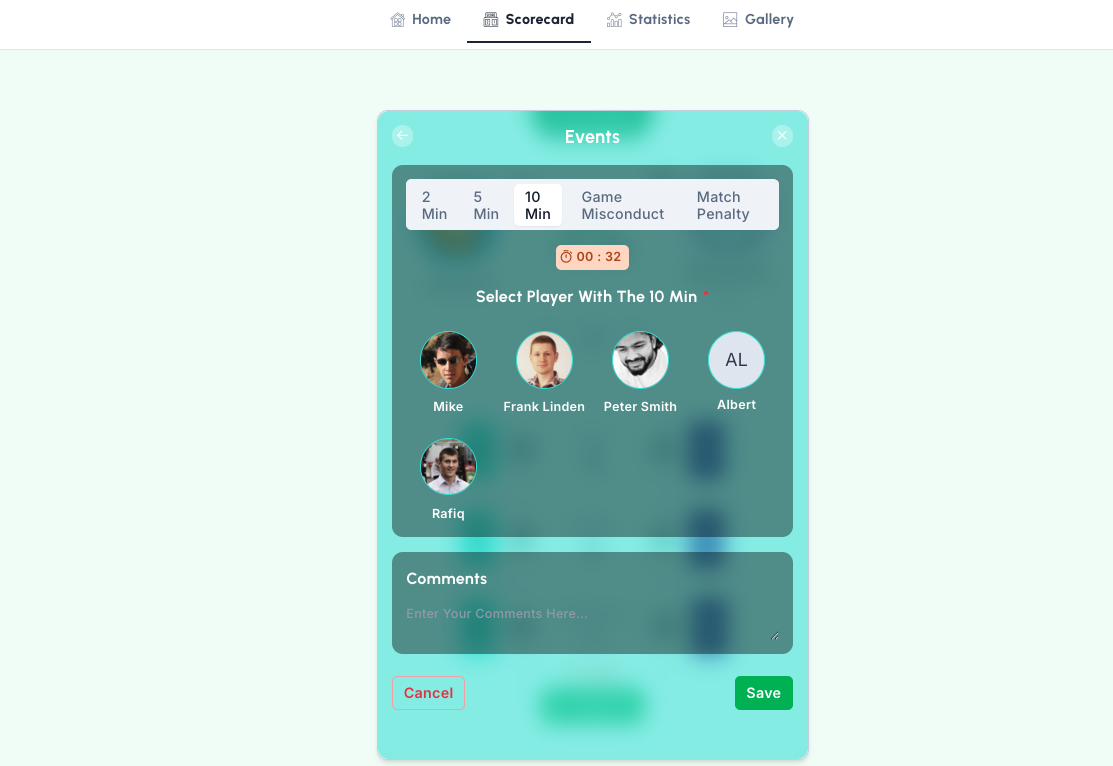 To add an event, click the ‘Events’ button and enter details such as the event type, player’s name and comments. You can add multiple events for both teams.
