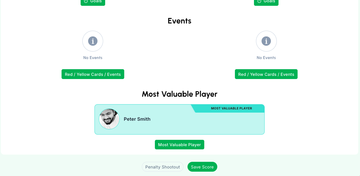 You can select one Most Valuable Player for the entire match. Click the Most Valuable Player button, then choose a player from the team you want to select. A Penalty Shootout option is also available—click the Penalty Shootout button if you need to record shootout results.