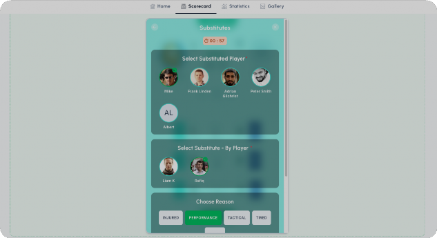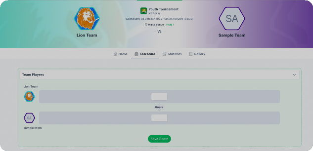 A pop-up will appear where you can select the players participating in the match. Click on each player’s image to add them, and assign their roles using the dropdown menu. You can also choose a Captain, Vice captain and Goalie from the selected players. Repeat the same process for the opponent team.