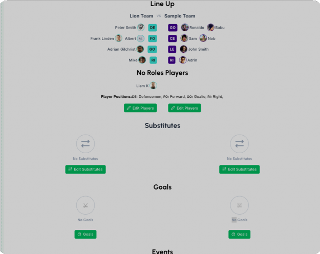 Here, you can record goals, substitutions, and events for each team using the respective buttons.