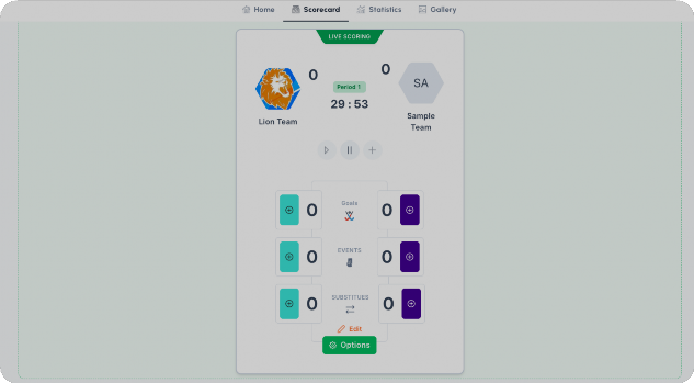 To record match actions, use the buttons provided on each team’s side. You can add goals, substitutions, and different match events as they happen.