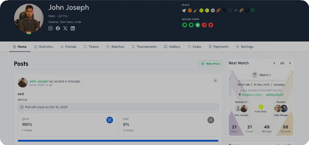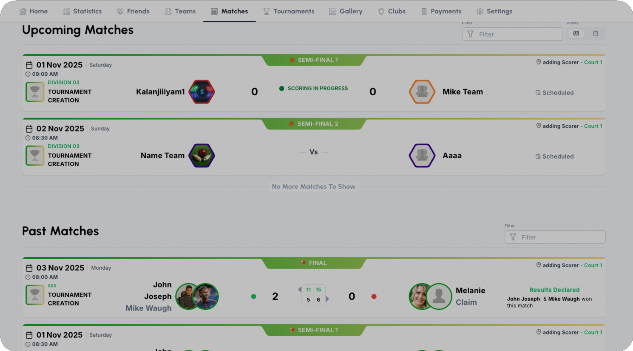 Managing your player schedule (Manage Schedule) is easy with PLAYINGA, for every time you schedule a match or choose to participate in a match or tournament, your PLAYINGA calendar gets automatically populated with list of matches & dates, so the next time you open your profile page, you will be intuitively reminded by PLAYINGA of your next match and other upcoming matches.