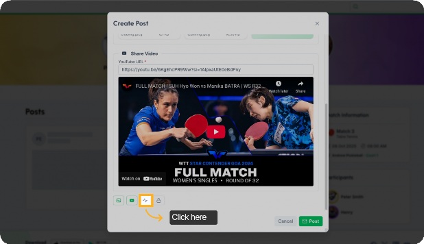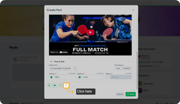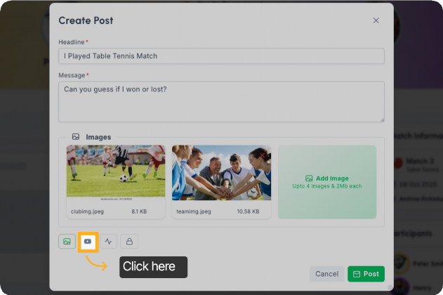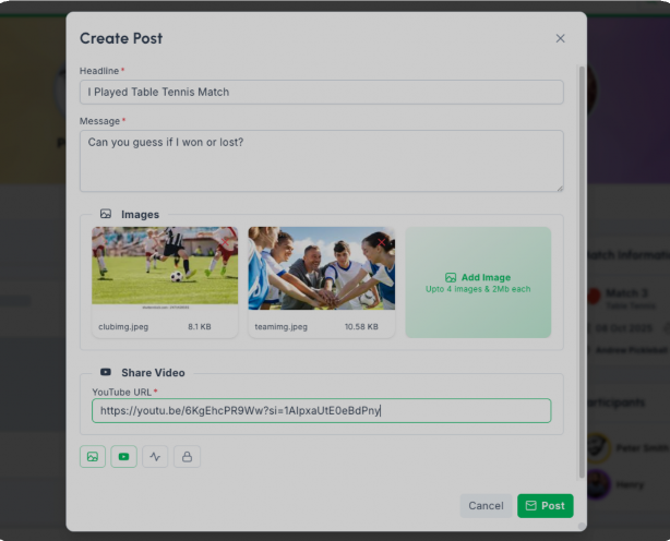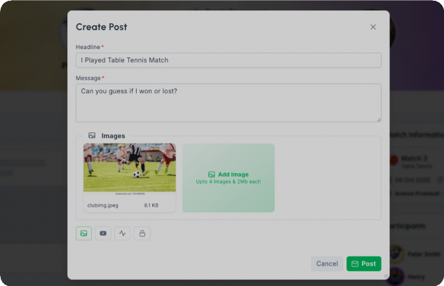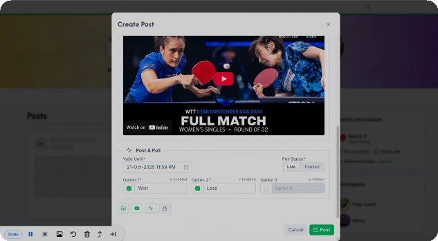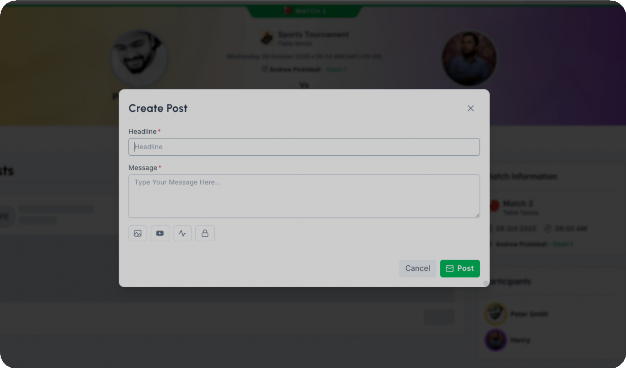 Match Feeds are a great way to keep participant teams or players informed and engaged. From your match page you can create feeds to inform and engage players or participant teams through text and/or media clips. The Match Feeds you create will appear in the timelines of the participant players including yourself and in the timelines of the participant teams, in case of team matches