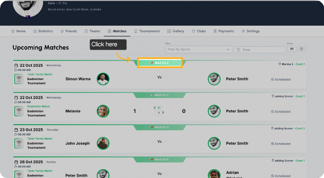Click on matches sub-tab in the top middle of your profile page. A list of matches you have scheduled appears. Click on the match of interest to go to its respective Match page.