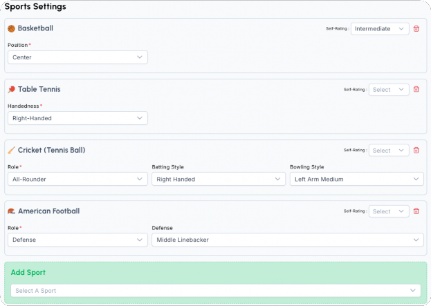 Step 3: Here, You can also set your role or playing position and provide a self-rating for that sport.