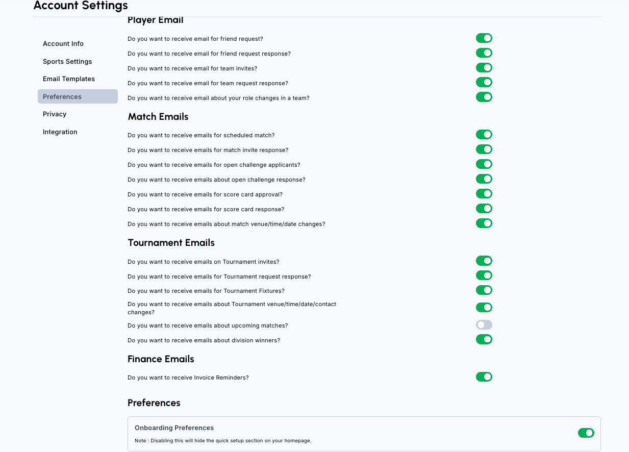 Step 2: In the Email Preferences section, you can control which emails you want to receive.For each category — like players, matches, tournaments, and finances — you can enable or disable individual email notifications.