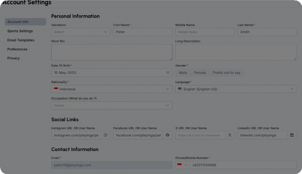 Step 2: In the Settings section, you can update your personal details such as name, date of birth, nationality, and more. You will also find options to add your social media links, which will appear below your banner image on your profile page.