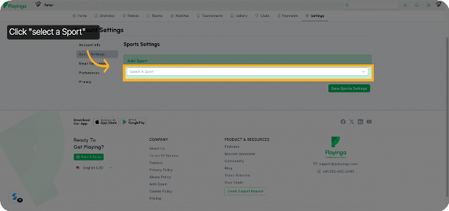Step 2: To add a sport, click on the 'Select a Sport' button and choose a sport from the drop-down menu.