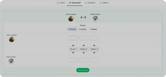 Enter the set results by recording the points won by each side for each game. Once the points are enter click the Save score button.