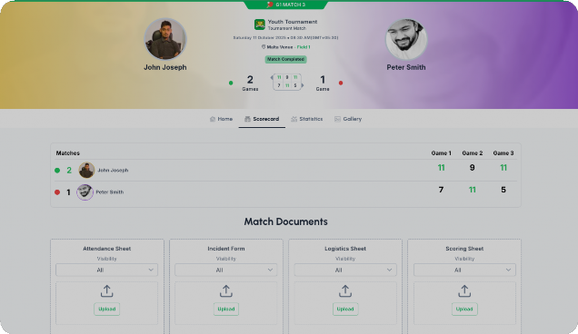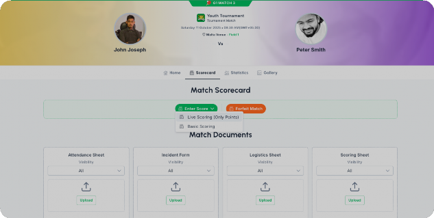 For matches in a tournament, the tournament organizer can enter the scores for each of the tournament matches and publish the league match results. After each match, the results of that match can be captured as a scorecard. A scorecard records each ...