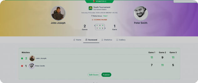 With PLAYINGA, you can choose between 3, 5 or 7 games and you can also use live scoring options to record points only. The side which gets the maximum points in a game wins the game.