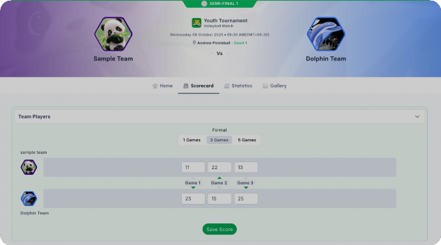 Enter the set results by recording the points won by each side for each game. Once the points are enter click the Save score button.
