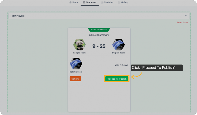 After clicking the Save & Proceed button, you can record points using the available buttons. Once a team reaches the highest score, you will be prompted to publish the results.